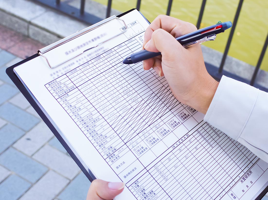 定められた作業手順(「採水業務マニュアル」)に基づき、採水並びに水質変化を防ぐための前処理(濾過作業など)を、熟練したスタッフが行います。また採水時は、採水位置や天候、水温、透視度などの現地状況を記録します。この結果は、分析結果に関連することから、評価に対する重要な指標ともなります。